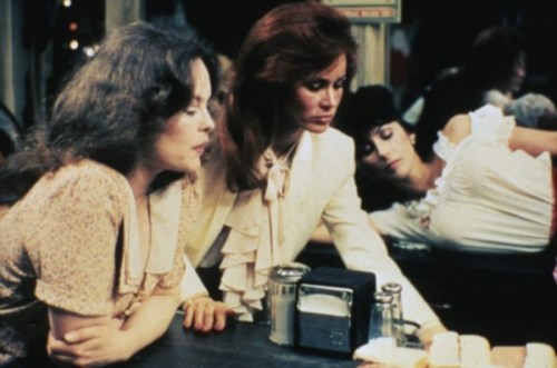 The setting is a 5 and 10 cent store/diner in a godforsaken Texas town. The year is 1975. A group of women are members of a James Dean fan club gathering on the 20th anniversary of his death. Dean has a special meaning for them as they were around when he filmed Giant (1956) nearby. Three club members are still employed at the store. They are proprietress Juanita (Sudie Bond) and waitresses Sissy (Cher) and Mona (Sandy Dennis). Mona is proud to have been chosen as the mother of Dean’s son, Jimmy.